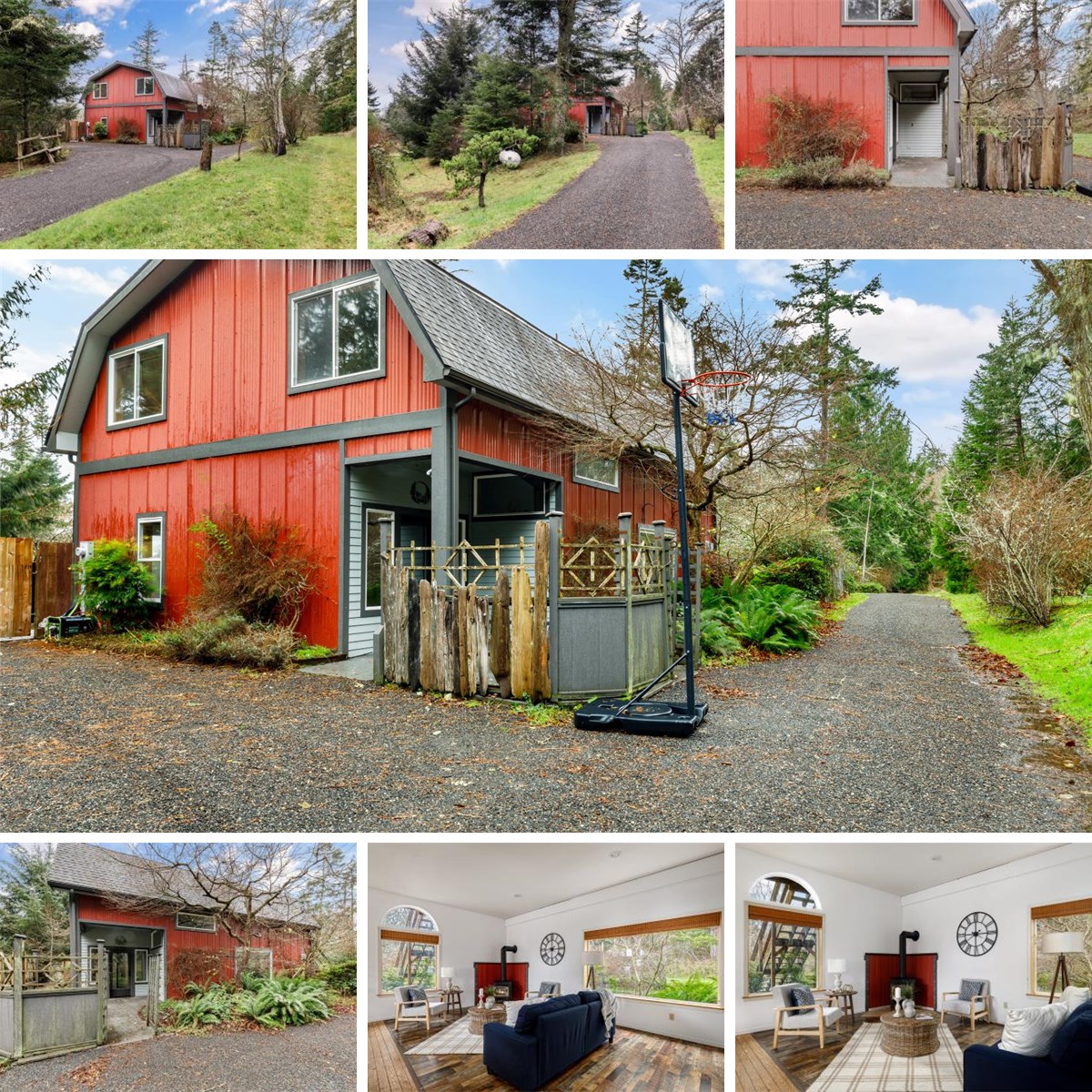 Escape to the country & find your island dream! This enchanting barn-style home invites you to wake to sunlight streaming through dormered windows, filling the freshly painted interior w/ warmth. Soaring ceilings, & abundant natural light create a warm, airy elegance. Smartly designed kitchen + cozy breakfast nook offer mornings of coffee & connection. Enjoy indoor-outdoor living w/ plenty of entertaining space among the many flowering plants, towering sequoias, & secluded woods, including well-established orchard: apples, pears, plums, cherries, elderberries, & majestic hazelnut tree. Soak in the tub, gaze at western sunsets, or gather under the stars. With new driveway, RV hookups, & Greenbank Farm + trails nearby, opportunities abound!